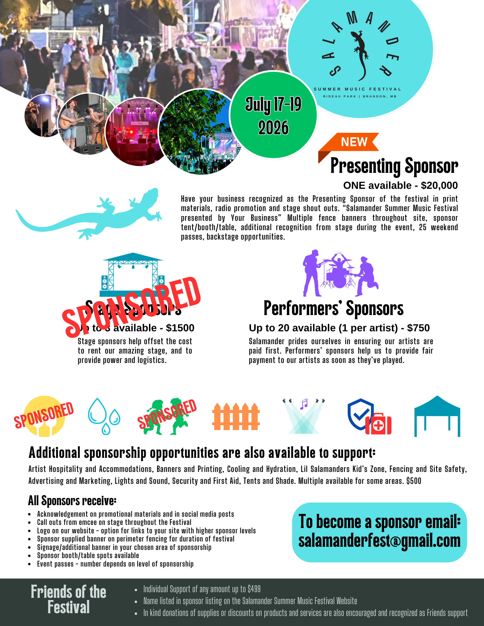 Join us as a proud sponsor of the Salamander Summer Music Festival – July 18–20, 2025! Help bring live music, community spirit, and family fun to life by becoming a Performers’ Sponsor, or supporting key areas like hospitality, safety, or tents and shade.